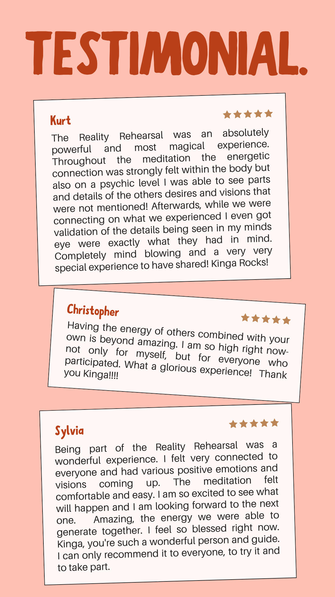 Book a FREE 15-minute Reality Rehearsal call with Kinga, and tell her all about your dream life, whether it’s next month or a decade away, as if it’s already real.Together you will explore it, ask and answer playful questions, and feel into the energy of that reality. A chance to practice becoming the future version of you.When two or more people imagine a possibility together, something interesting happens. The brain begins to treat it as more real, strengthening belief and helping you notice opportunities that align with it.By sharing your vision, you tap into the collective field, making possibility feel even closer! In this short call we simply explore your vision together and see what opens.
